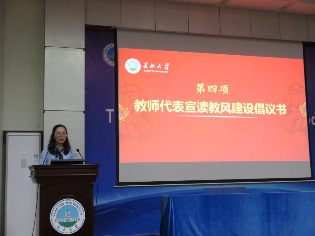 教师代表胡洁宣读教风建议倡议书,她明确指出各年级学风建设的目标,希望每位学子都能做一个适合自己的职业生涯规划,为自己的大学生活开启一盏导航的明灯,从而开创更美好的未来。